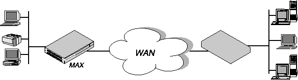 In this example, the local Ethernet supports NetWare clients, and the remote network supports both NetWare servers and clients, so the MAX requires IPX client bridging. When Handle IPX=Client, the MAX applies a data filter that discards RIP and SAP periodic broadcasts at its WAN interface, but forwards RIP and SAP queries. That way, local clients can locate a NetWare server across the WAN, but routine broadcasts do not keep the connection up unnecessarily.
