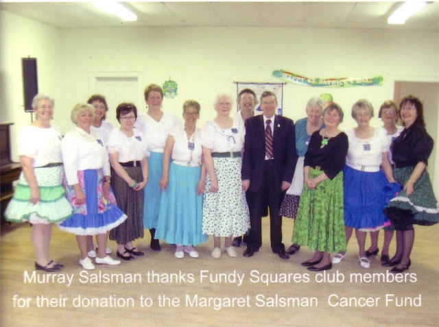 The Fundy Squares Dance Club held their annual “Pot Luck Supper & Benefit Dance” on the 12th of March. The club raised and donated $450 to the Margaret Salsman Cancer Care Memorial Fund. The funds were presented to Murray Salsman by Club President Al Worthen. Mr. Salsman attended the supper (see below) and spoke briefly on the good works the fund provides in the area. He is well known in the Valley as the operator of GLAD GARDENS where he raises Gladiolus to raise money for this fund. All money received goes to help cancer patients and their families in our area – aid includes drugs, food, oil, transportation, rent, mortgages, utilities and ambulance service. Referrals come from the “Cancer Care Patient Navigator” at the Kentville hospital.