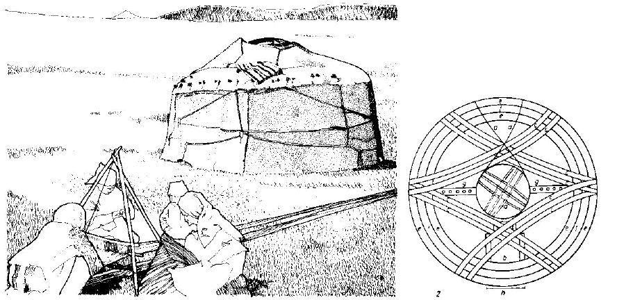 related to the Mongol kibitka. The conical shape and construction of their