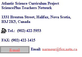 The authors and board members of the Atlantic Science Curriculum Project are always interested in hearing from science teachers and science curriculum specialists about current issues in science education. They also welcome specific comments, questions and suggestions about any of the editions of SciencePlus which have been developed over the past twenty years. |