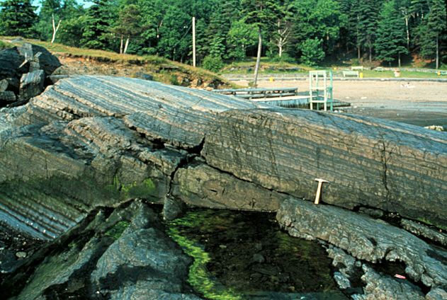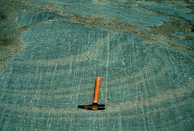 | PPP bedrock showing striations with hammer for scale |