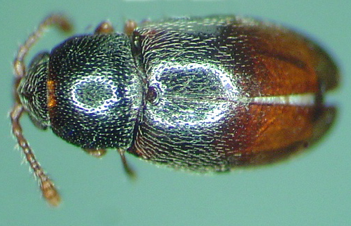 - 3(2) Elytra testaceus with a prominent piceus crossbar at the mid-point, either interrupted or continuous across suture; pronotum and prosternum piceous. 1.5-1.6 mm. ---- Atomaria ephippiata Zimmerman