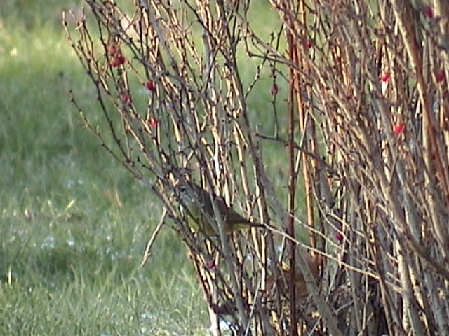The bird was often seen in the barberry hedge which runs along the front and west side of 6667 Jubilee Road. I observed it feeding by moving along the length of the hedge, also moving to the forsythia bush that is in the front yard. From there it several times moved to a large hedge that is in the back yard of 1720 Bloomingdale Terrace. The back yard of this house is separated from the previous by a large stone wall and it perches there, flying in an out of the hedge. It also forgaed low down amongst the lower limbs of the lilac bushes that separate the two yards.