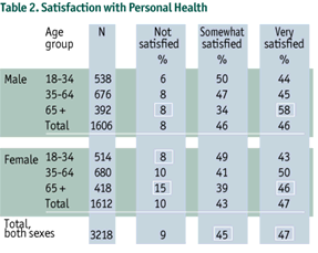 When asked how satisfied they were with their own health, 92% of Nova Scotians reported being somewhat or very satisfied (Table 2). Older women (65+ years) were less likely to be satisfied with their health than older men and young women (18-34 years) (p < 0.05). Older men were more likely than any other age and sex group to be very satisfied with their health.