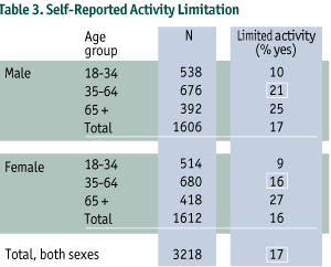 Seventeen percent of Nova Scotians reported that because of a long-term health problem they were limited in the kind or amount of activity they could do, compared to people of the same age. The percentage of people reporting limitations increased with age and was similar for men and women, except for the 35-64 year age group. In this age group more men (21%) than women (16%) reported health-related limitation of activities (p < 0.05) (Table 3).