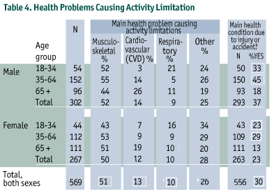 When the health problems that led to activity limitations were considered, musculoskeletal problems were linked to limitation most frequently by 51% of adults, followed by cardiovascular problems (13%), and respiratory problems (10%) (Table 4). The percentage of health limitation resulting from CVD increased with age, while the highest level of respiratory problems occurred in the youngest age group. Thirty percent of those with some degree of health-related activity limitation said injury or accident was the cause, and the percentages were highest in the age groups below 65 years. Injury or accident was more likely to be a reason for health limitation in men than in women.