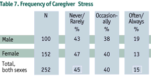 Almost half of adult caregivers (45%) indicated that this role was rarely or never stressful for them. Fifty-five percent reported at least some stress, and within this group, 15% were often or always stressed (Table 7). However, on further questioning, the majority of caregivers (83%) indicated that they were usually or always able to cope.