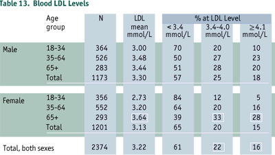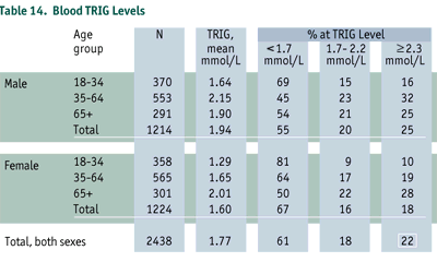 LDL cholesterol and TRIG levels (Tables 13 and 14) showed a similar pattern to total blood cholesterol. Mean values tended to rise with age for both sexes, levelling off for men age 65 and older and continuing to rise for older women. Thirty-eight percent of adults were at risk from elevated levels of LDL cholesterol (> 3.4 mmol/L) and 16% were at high risk (> 4.1 mmol/L), with older women (65+ years) making up the largest percent of both groups. Twenty-two percent of the population was at risk from high blood TRIG levels (> 2.3 mmol/L).
