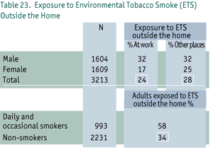 Research has identified exposure to second-hand smoke or environmental tobacco smoke (ETS) as an important health-related issue with impact on CVD and cancer rates (Shepard, 1992; Steenland, 1993; Wood&White, 1991). In fact ETS increases risk of death by 20 to 30% for non-smokers married to smokers. (Heart and Stroke Foundation of Canada, 1994). When asked about exposure to ETS, approximately one out of four respondents was exposed to ETS almost every day at work or in other places outside the home. More men than women were exposed, especially at work (p < 0.05). Thirty-four percent of non-smokers reported being exposed (Table 23).