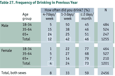 While 2,456 Nova Scotians (76% of respondents ) consumed alcoholic beverages in the past year and the percentage was similar for both sexes, men consumed alcohol more frequently, and in greater quantities than women (Tables 27 and 28). The majority of female drinkers (73%) and less than half of male drinkers (46%), reported drinking two or fewer times per month. While a relatively small percentage of adults reported drinking four to seven days a week (12% of males and 4% of females), the numbers in this category increased with age, especially for males, with 24% of those aged 65 and over reporting this frequency (Table 27).