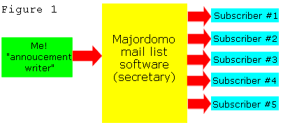 Welcome to my second article for the Beacon. Last issue we discussed FTP and how Chebucto Community Net Information Providers can use it to update their sites. In this issue we will take a look at mailing lists and a really nice piece of software called "Majordomo". Mailing lists are a really useful means of sharing information and Majordomo is a software package designed to run a mailing list; it also happens to be the software that CCN is running to manage mail lists. There are as many different types of lists as there are ways for Homer Simpson to exclaim "D'oh!" but they are all based on SMTP mail and list server software. Some examples are discussion groups, announce lists, feedback lists, and support lists. As a CCN IP you already have one e-mail list; mine is akc-ip@chebucto.ns.ca. Requests to the mail list administrator may get you more if you feel you need them for something. At this point, I suspect you're asking yourself why you would want the list you already have let alone another one. There are many reasons to run a mail list. Maybe your site is managed by a number of IPs and you want to easily keep track of updates, etc. via email. You could, of course, run a discussion group for the people in your organisation. You could even run an announcement list to let people know about upcoming events being held by your organisation. Let's take a step back for a minute and take a look at how a list server does its job before we actually talk about running a list. I often find it helpful to know a little bit about how something works before I use it. So let's look at how I could use my list as an announcement style list. For instance, when I add a new copy of the AKC's newsletter, Zanshin, I want to send out a notice to people to let them know that it is available for reading. Once I have a number of people subscribed and we'll talk more about this later, I am ready to make an announcement. To make the announcement I send an email to akc-ip@chebucto.ns.ca with a subject line of "Issue 4 of Zanshin is now available". I would include some tidbits of information such as the wonderful article "A Year in Review" by some fellow named Glenn Euloth. The email arrives at CCN and since the address is akc-ip@chebucto.ns.ca, a Majordomo email list, the email is routed to Majordomo. Majordomo looks at it and sees that it is a message to be sent to all of the people who are subscribed to the list. It makes multiple copies of the email and sticks the address of each and every person who has subscribed to the list on it and sends it to him or her. Think of Majordomo as a secretary. Take a look at Figure 1 and see if it makes more sense picture-wise.